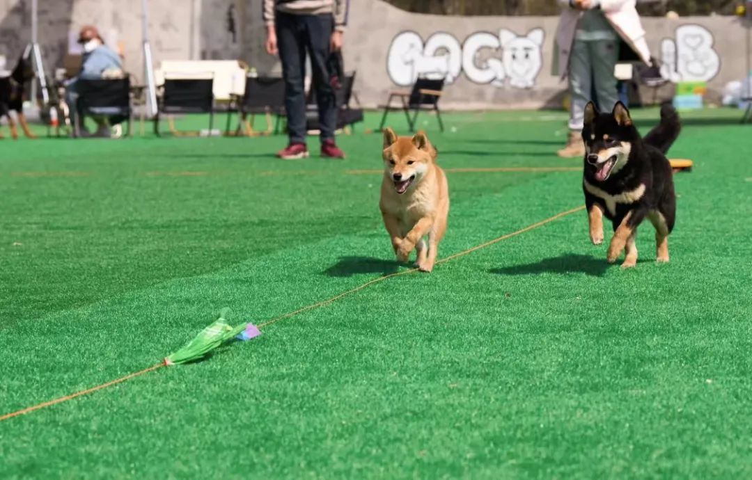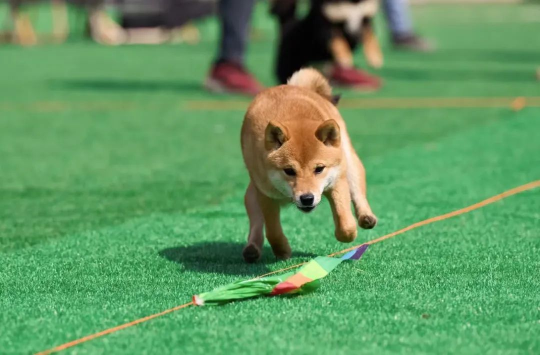3、宠主指引爱犬看向晃动的目标物,裁判吹哨开始比赛计时,爱犬追逐目标物跑完一圈,裁判喊停,计时结束,全场用时最短的前三名获奖。