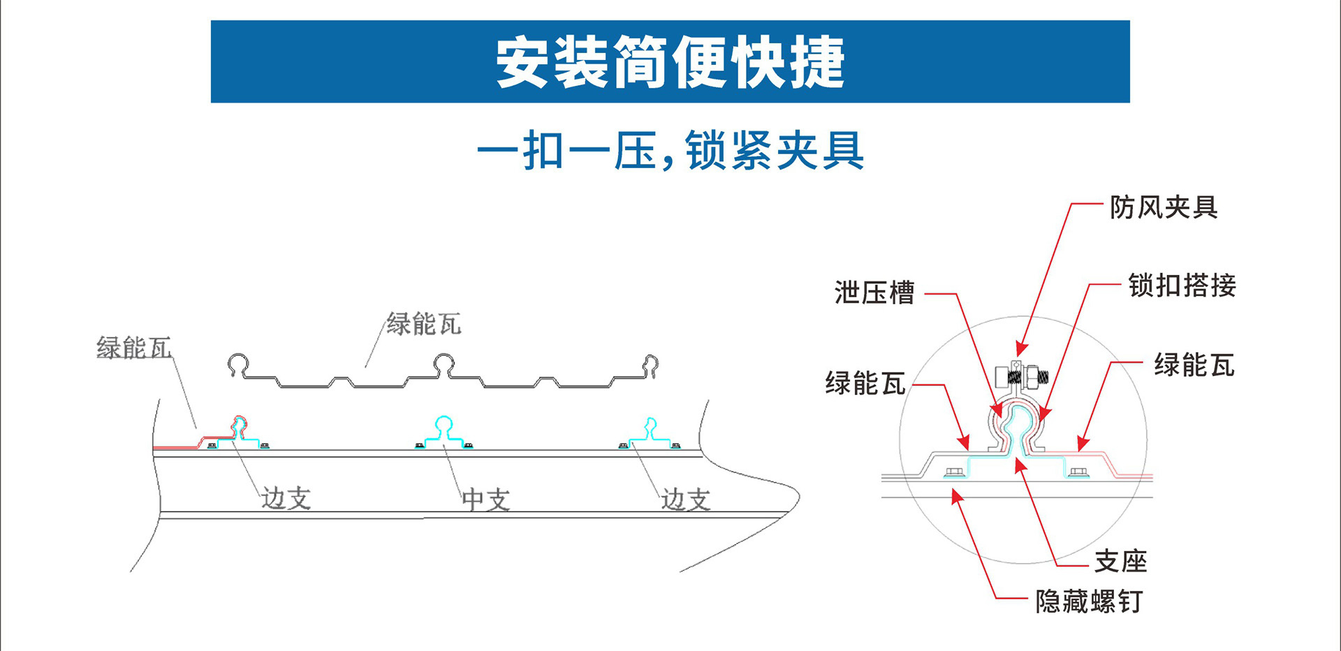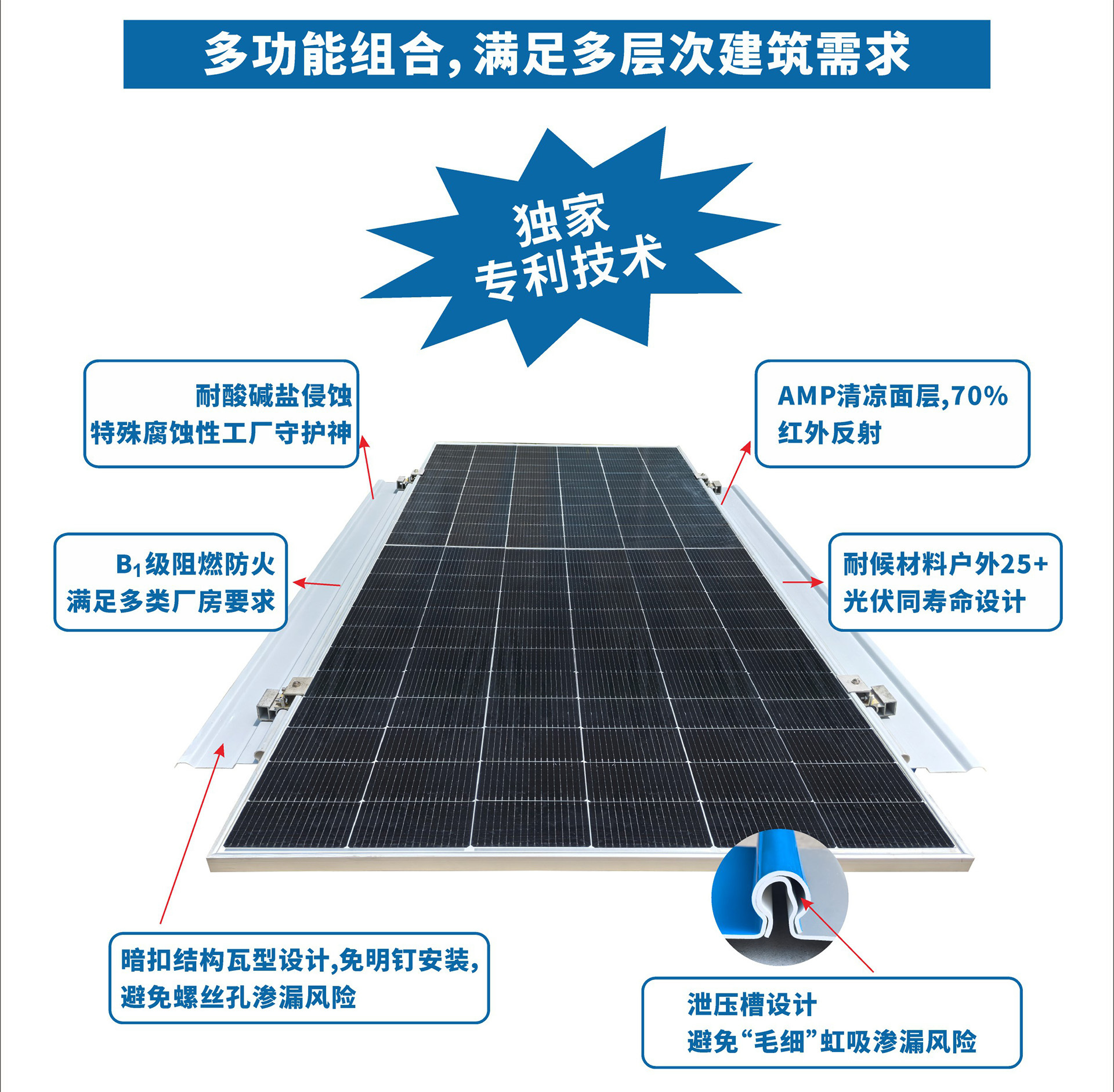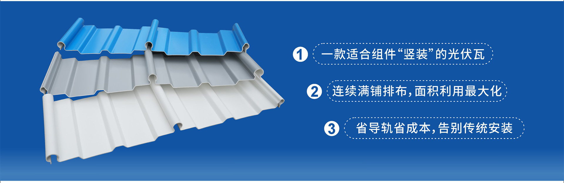 1、一款适合组件“竖装”的光伏瓦 2、连续满铺排布,面积利用最大化 3、省导轨省成本,告别传统安装